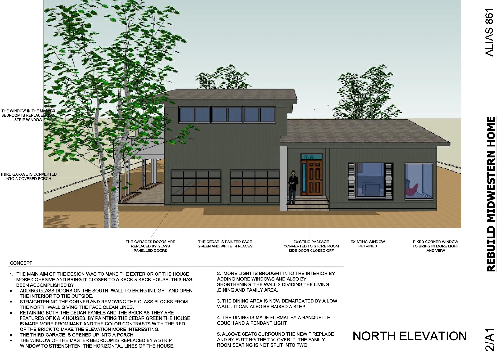 The third garage is opened up to make a portico and a small unmatched window in the first floor master bedroom replaced by a strip window to strengthen the horizontal lines of the house.