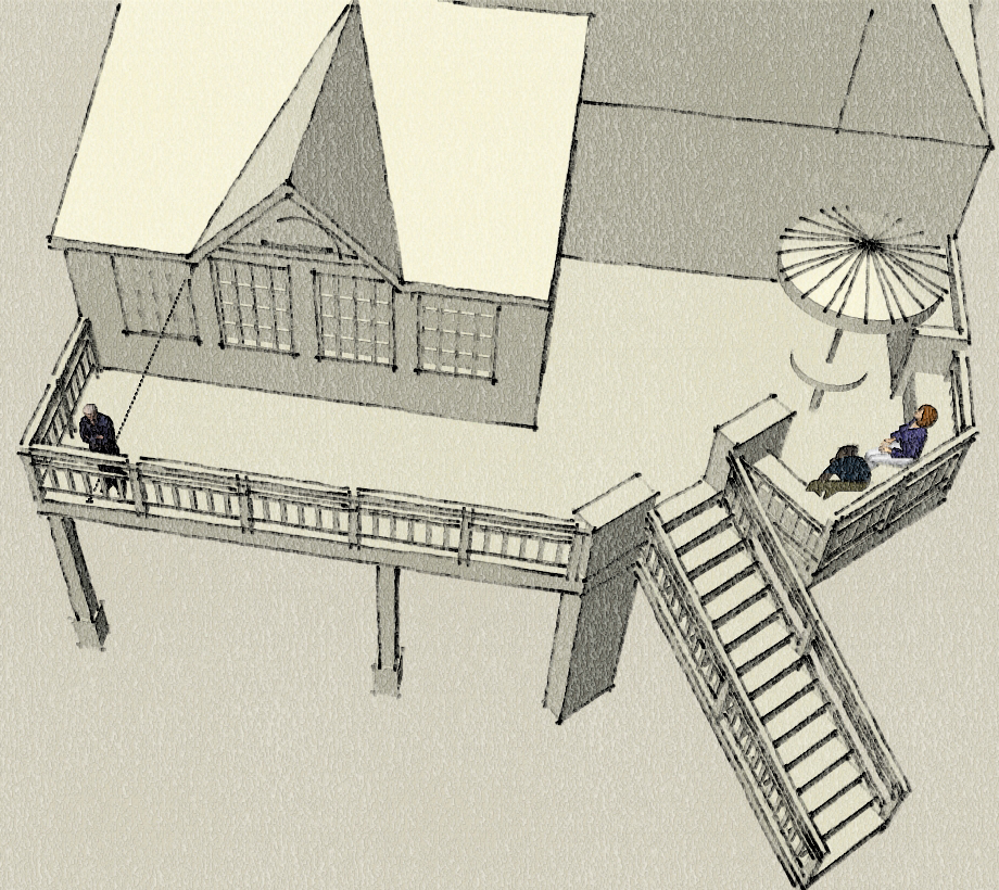 The proposal I sent opens up their dining room and kitchen to the new sun room which leads to the deck. The raised deck is unconventional in shape.